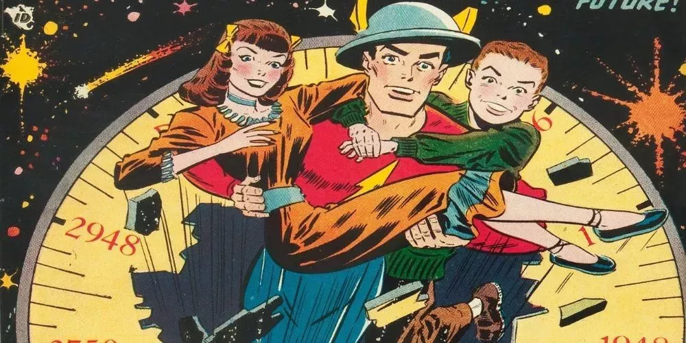 Otro elemento básico de las historias de Flash es el viaje en el tiempo, y la versión de la Edad de Oro del Velocista Escarlata no era ajena a este tropo. En Flash Comics #101, de Broome e Infantino, Flash y sus amigos adolescentes Sue y Ted hacen un viaje de mil años al futuro, al año 2949.