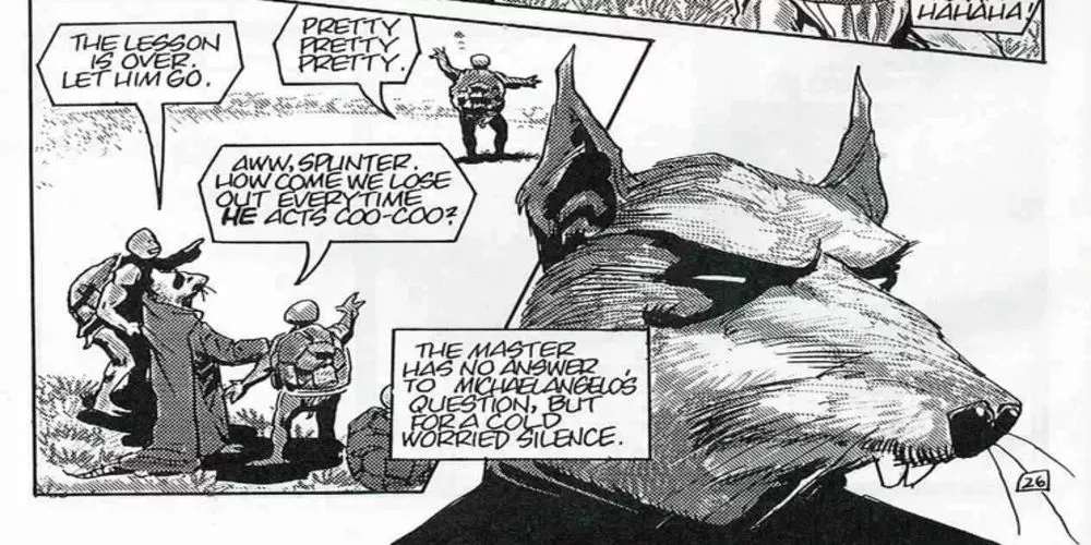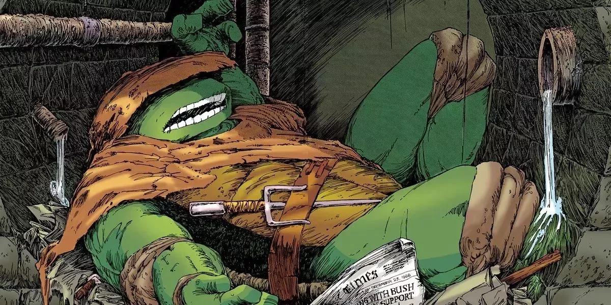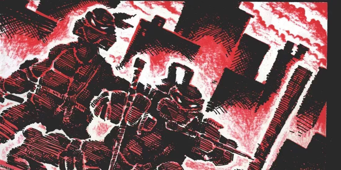 Eastman y Laird se inspiraron en la sensibilidad de los arenosos cómics de Daredevil de Frank Miller y la injertaron en el improbable tema de unos anfibios entrenados en ninjitsu. En su primera batalla contra su némesis, Shredder, hay una sorprendente cantidad de caracterización, personajes conocidos y acción emocionante.