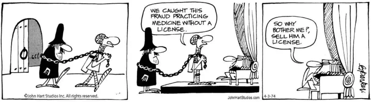 El Rey de Id es un personaje muy corrupto, y su codicia y ambivalencia hacia sus súbditos aparecen a menudo en varias tiras. El chiste de esta tira no fue diferente, con Sir Rodney trayendo a un infractor de la ley que fue sorprendido practicando la medicina sin licencia. Al ser informado de las acciones del individuo sin escrúpulos, el Rey se mostró confuso sobre por qué se le molestaba. En su lugar, le dijo a Rodney que le vendiera al hombre una licencia médica.