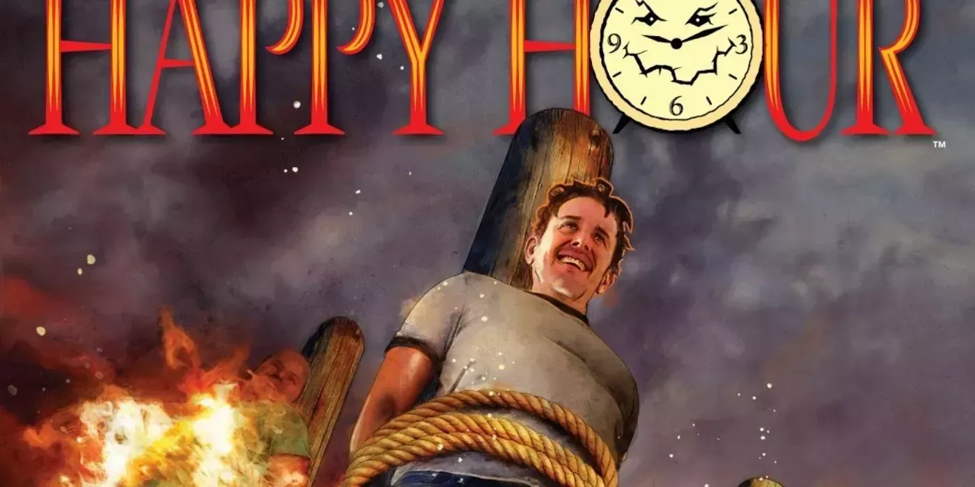 Los futuros distópicos son habituales en las historias de ciencia ficción, pero el género da lo mejor de sí cuando especula sobre la naturaleza de la sociedad. Happy Hour está ambientada en un futuro cercano en el que ser infeliz es un delito. Esto se promulga para combatir la infelicidad que causa las altas tasas de suicidio, adicción y otros males sociales. Cuando alguien sufre una pérdida, se espera que siga sonriendo.