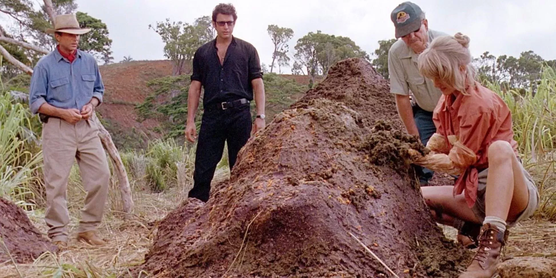 La Dra. Satler se sumerge con el antebrazo en una cantidad impía de estiércol de dinosaurio. El estiércol es en realidad una mezcla de barro, paja y arcilla. Untada con miel dulce y papayas para atraer a las moscas y otros insectos, esta escena resume lo que hace que Parque Jurásico sea impresionante: efectos especiales creíbles.