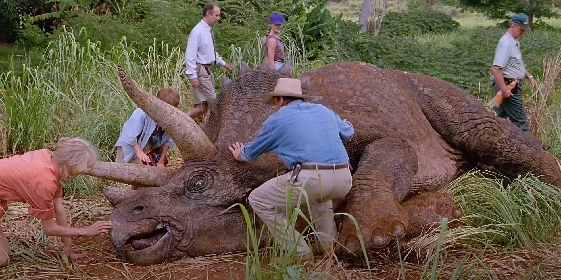 Otro momento sorprendente de Parque Jurásico es cuando el Dr. Grant, el Dr. Sattler, el Dr. Malcolm y los empleados del parque atienden a un Triceratops enfermo. Esta escena fue especialmente difícil de rodar, ya que se filmó en Hawái. Sin embargo, los titiriteros no tardaron en apreciar la decisión de Spielberg de rodar en el entorno, ya que toda la suciedad y el polvo unían la escena, haciendo que el Triceratops estuviera en la realidad.