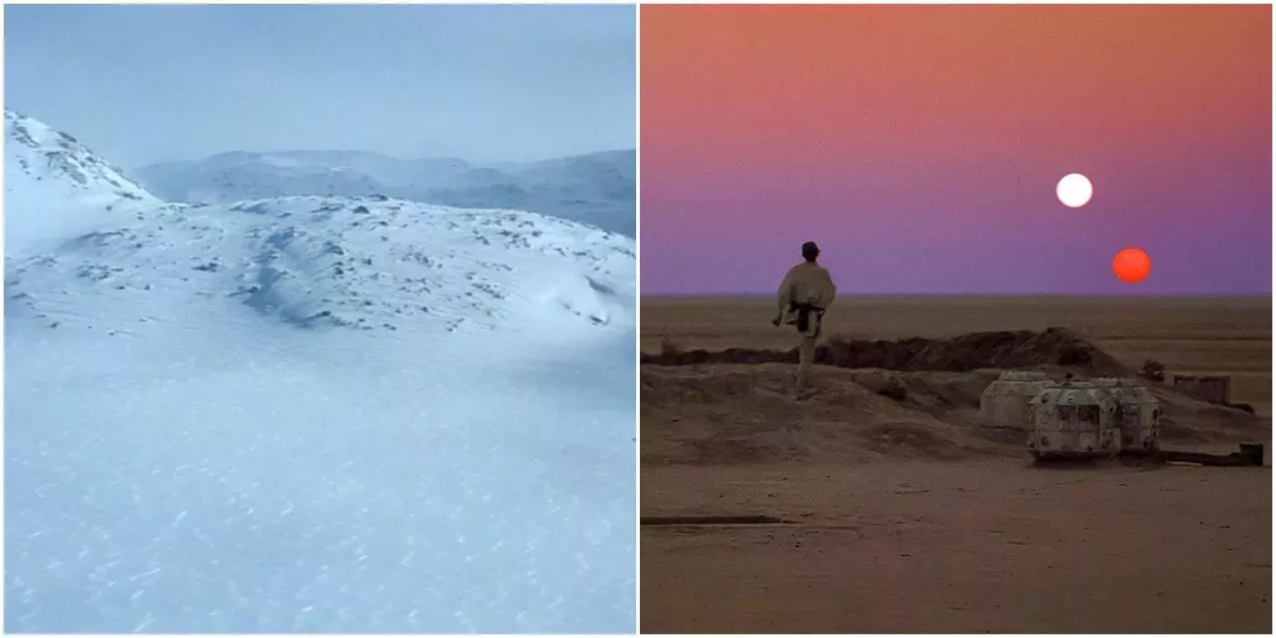 Muchos de los lugares más emblemáticos de la trilogía original se filmaron en lugares reales. Tatooine se filmó en Túnez y el Parque Nacional del Valle de la Muerte en California. El planeta Hoth se filmó cerca de Finse, Noruega. Los parques nacionales y estatales de Redwood sustituyeron a la luna forestal de Endor.