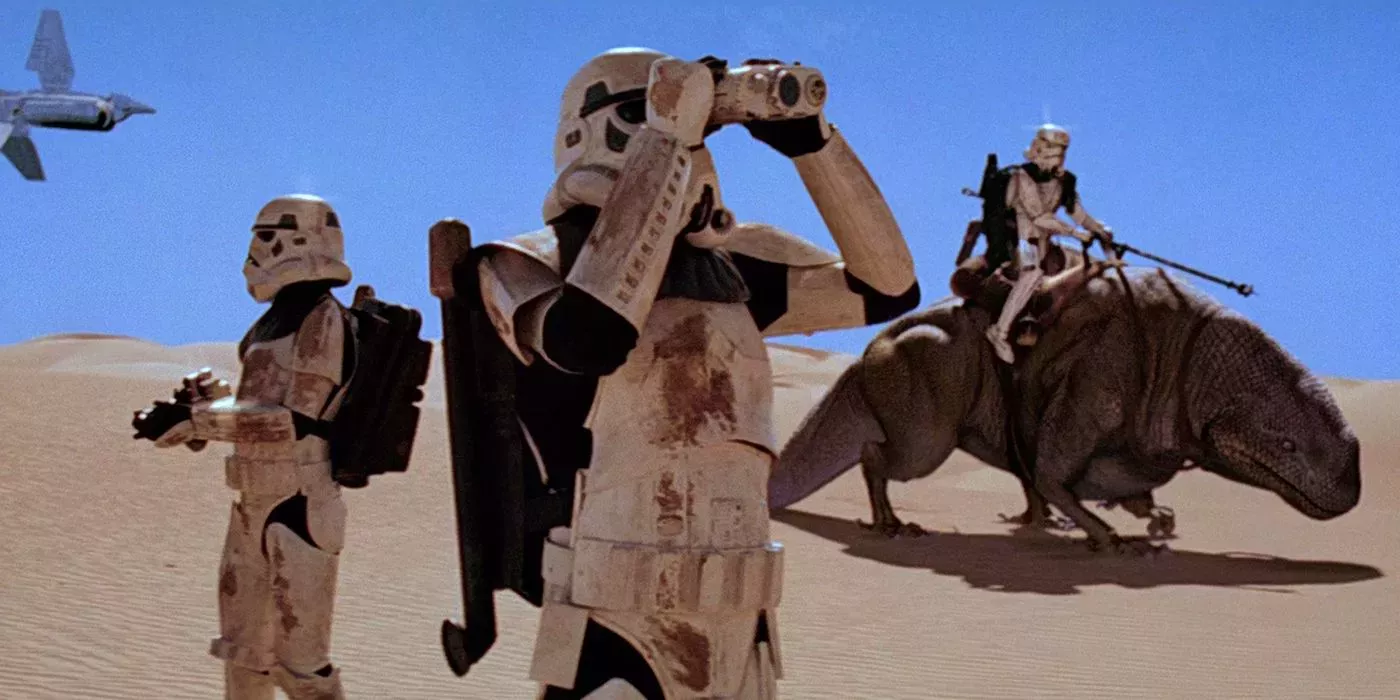 Dado que el CGI no alcanzaría su punto álgido hasta el siglo XXI, la producción encontró otras formas de aumentar el número de Stormtroopers. Los extras se pusieron la armadura de polietileno de alta densidad de la trilogía original. La presencia de los Stormtroopers también se incrementó mediante pinturas mate, que retrataban a más matones del Imperio de los que realmente había en acción real.