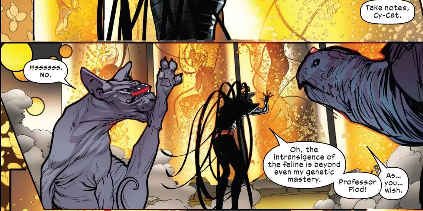 Una de las primeras revelaciones de X-Men Inmortales fue que, en su tiempo libre, Mister Siniestro ha estado llevando a cabo sus propios planes diabólicos, con la ayuda de un par de inusuales ayudantes de laboratorio: Cy-Cat y el Profesor Plod. Plod es una tortuga, pero Cy-Cat es un gato sin pelo con la visión láser y el visor de Cíclope.
