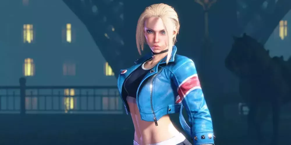 Cammy luce un corte de pelo mucho más corto y práctico, aunque su emblemático flequillo y sus cicatrices permanecen intactos. Ha cambiado el maillot verde por un crop top con una chaqueta azul claro con la bandera de su Gran Bretaña natal en la espalda. Se trata de un look mucho más divertido, pero que contiene suficientes rasgos del icónico aspecto de Cammy como para resultar reconocible.