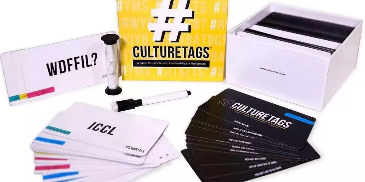 #CultureTags es un juego único hecho para la era moderna. Este juego consta de 350 tarjetas diferentes (y 5 tarjetas de bricolaje), 7 categorías distintas, y puede jugarse en persona o virtualmente. El concepto es sencillo: un jugador roba una tarjeta y todos ven la categoría, sólo tienen que adivinar el acrónimo de la tarjeta.