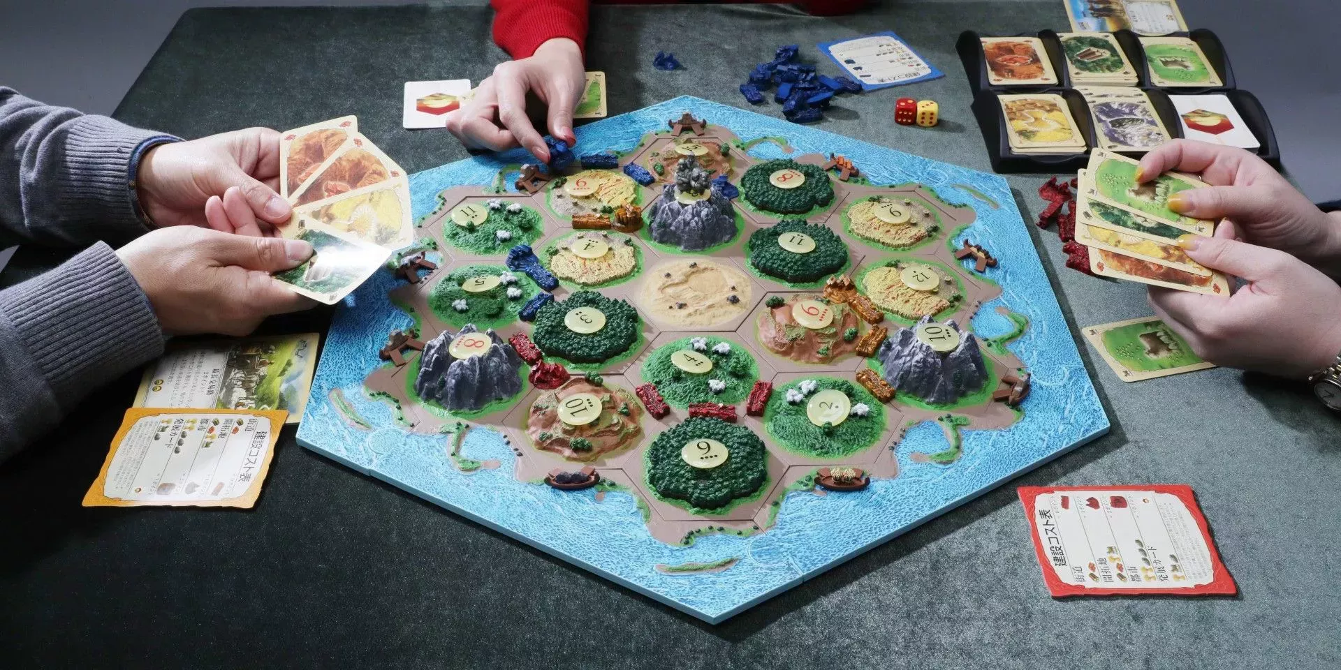 Para construir estos elementos, deben utilizar los recursos que obtienen del terreno circundante. Estos materiales básicos, ladrillo, madera, mineral, grano y lana, proceden de las distintas losetas de juego y pueden intercambiarse entre los jugadores.