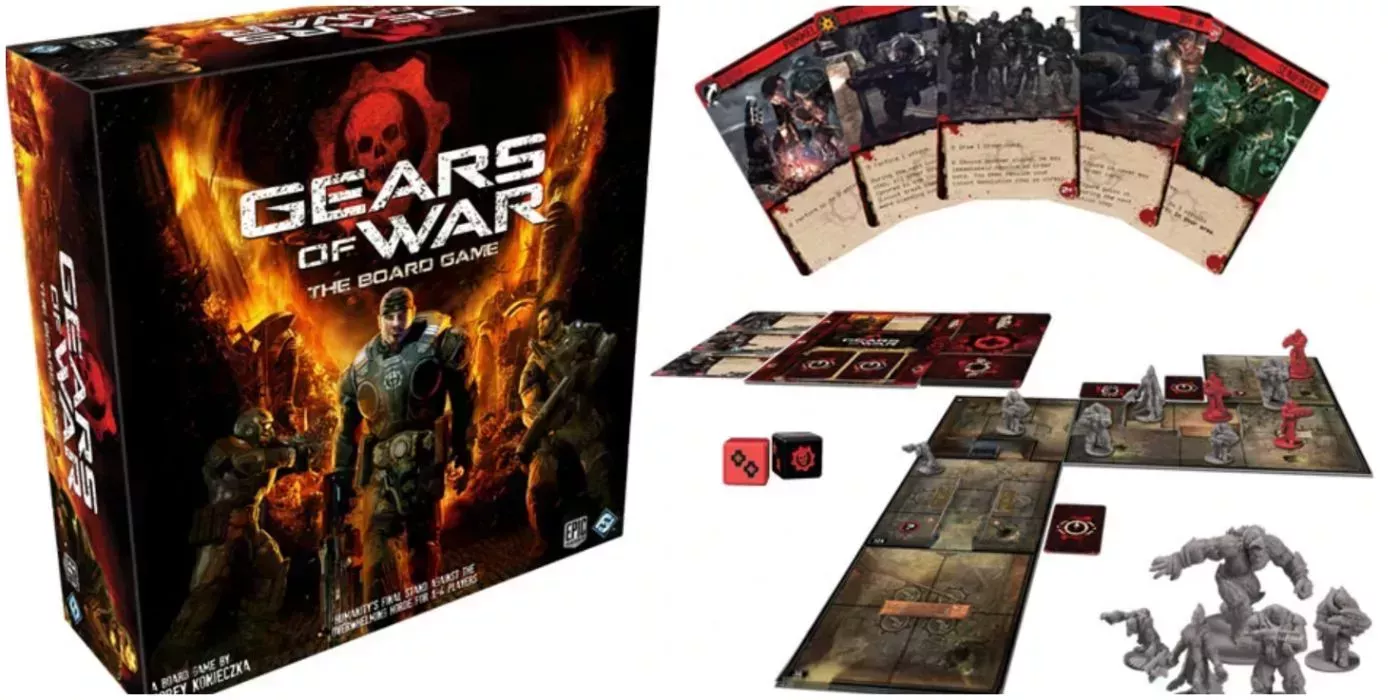 Gear Of War: The Board Game pone a los jugadores en la armadura del COG como uno de los miembros del Escuadrón Delta de los tres primeros juegos de Gears of War. Los jugadores deben organizar una misión con fichas colocadas al azar que presentan enemigos Locust a los que deben enfrentarse juntos.