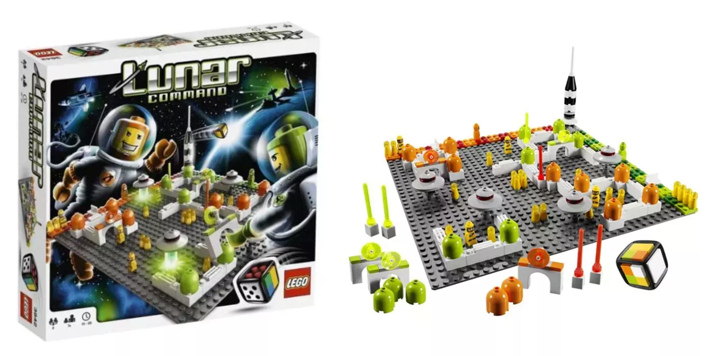 LEGO Lunar Command lanza a dos jugadores al espacio para establecer una base y reunir una tripulación. Los jugadores tiran el dado para adquirir piezas de la base o miembros de la tripulación robótica, mientras que también tienen la opción de enviar ovnis a su oponente.