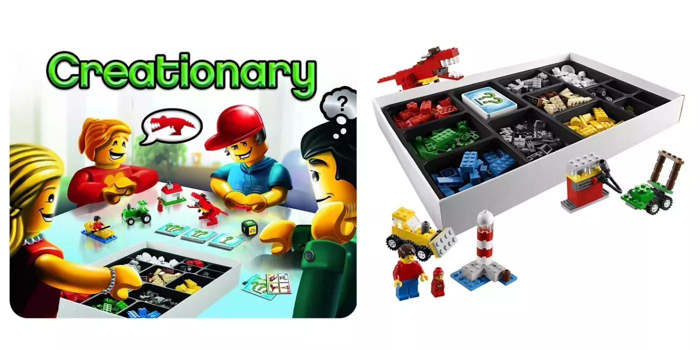 LEGO Creationary da un giro de LEGO al Pictionary. En un juego de pura imaginación, los jugadores deben sacar una tarjeta y luego hacer que los otros jugadores adivinen lo que hay en la tarjeta ensamblando algo del montón de ladrillos LEGO variados que se incluyen en el juego.