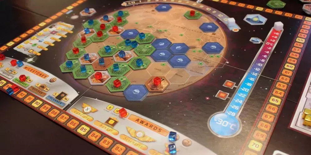 Muchos juegos de estrategia tienen una temática explícitamente militar, o al menos incluyen la guerra como una opción que los jugadores pueden utilizar para salir adelante. Terraforming Mars, sin embargo, se aleja deliberadamente de esto, poniendo a los jugadores en control de corporaciones que buscan hacer de Marte un lugar habitable para los seres humanos.