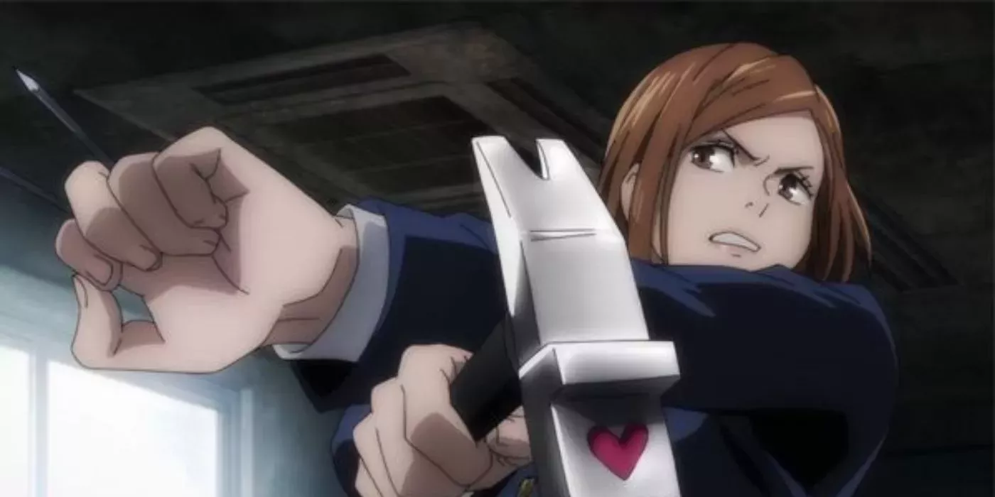 Nobara Kugisaki, de Jujutsu Kaisen , empuña un martillo estándar con un corazón en la cabeza. Utiliza clavos infundidos con energía maldita para atacar a sus oponentes desde largas distancias.