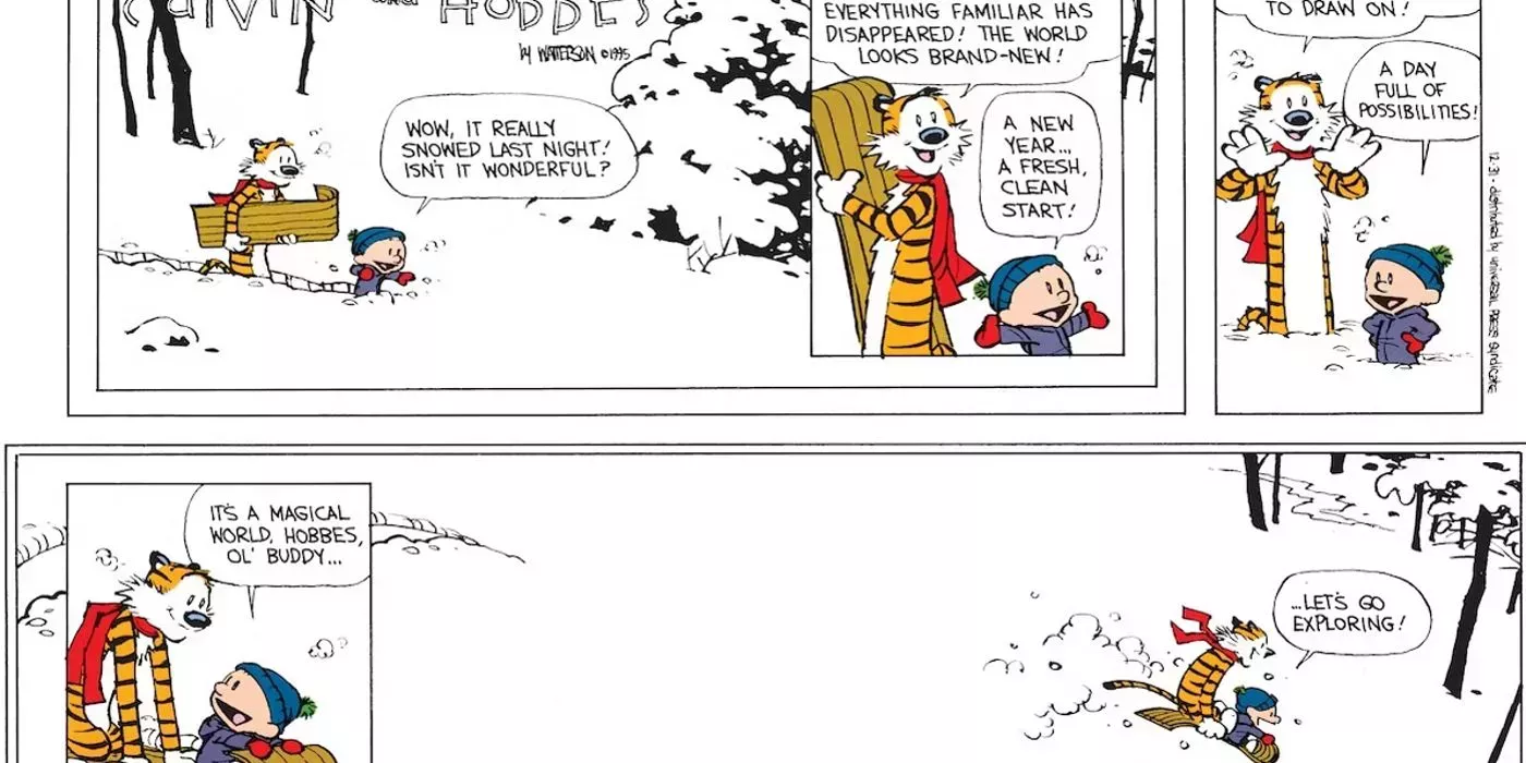 La última tira de Calvin y Hobbes es única porque no hay ningún chiste subyacente. Bill Watterson reconoció que no era necesario. Calvin y Hobbes se despiden y la pareja existe tal como es. Se enfrentan a lo desconocido y lo exploran con un trineo y su equipo de invierno.