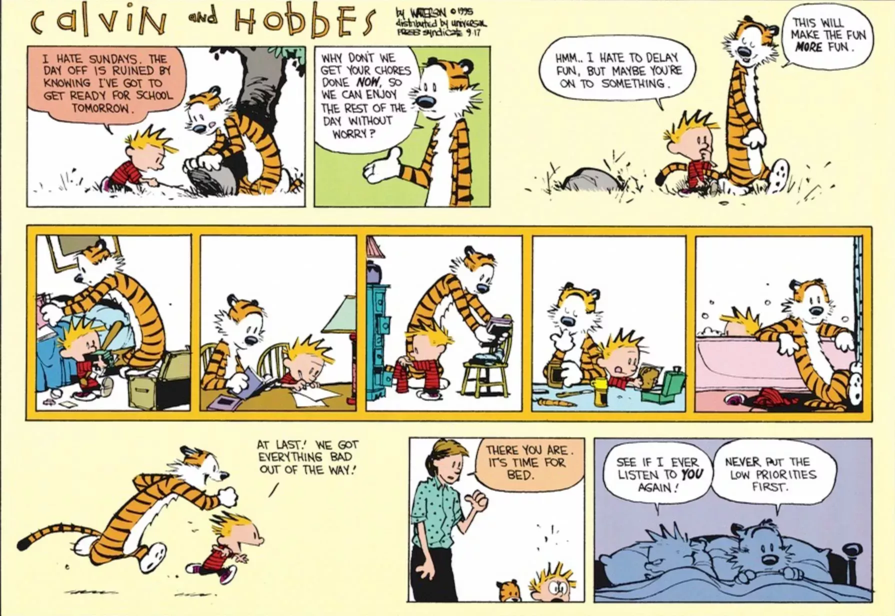 A Calvin yHobbes le encanta representar a sus personajes centrales explorando la naturaleza. En un cómic cualquiera, Calvin y Hobbes pueden adentrarse en el bosque y prepararse para iniciar peleas de bolas de nieve o para jugar al Calvinball. Una de las aventuras de Calvin surgió cuando él y Hobbes decidieron hacer sus tareas antes de jugar. Después de cumplir con todo, la madre de Calvin les informa de que ya es hora de irse a la cama.