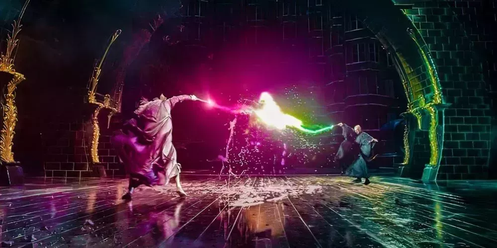 Llamas, fragmentos de cristal, chorros de agua y energía oscura chocaron cuando Dumbledore se batió en duelo con Voldemort, mientras se aseguraba de que los alumnos que le rodeaban se mantuvieran a salvo. Fue una batalla épica que demostró lo competente que era Dumbledore como mago.