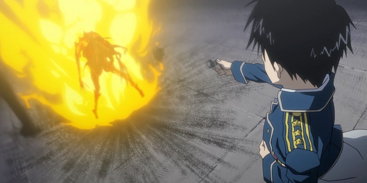 Roy Mustang, aunque es uno de los más poderosos Alquimistas Estatales en el Alquimista Fullmetal, también es una especie de pony de un solo truco. Básicamente, este "Héroe" de la Guerra Civil de Ishval utiliza un tipo complejo de alquimia de llamas (con un trasfondo realmente oscuro) que se cose en sus guantes Pyrotex para crear llamas con un simple chasquido.