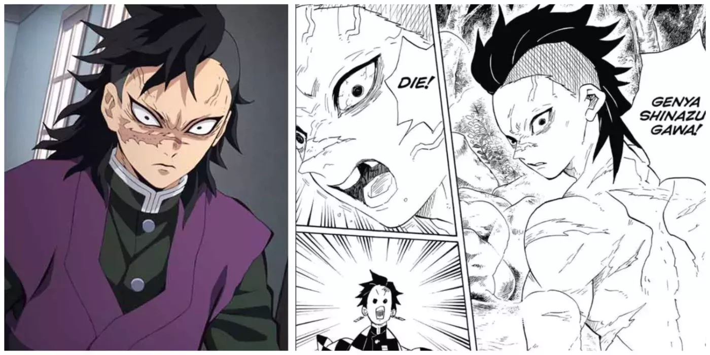 Los espectadores ven por primera vez a Genya cuando Tanjiro va a relajarse y recuperarse en las aguas termales de la aldea Swordsmith. El excéntrico cazador de demonios se arranca los dientes y se los echa al hombro.