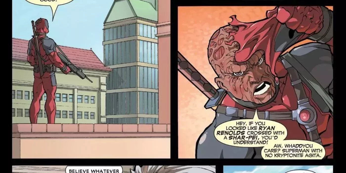 En Cable and Deadpool #2 de Fabian Nicieza y Mark Brooks, publicado en 2004, Deadpool hizo una indirecta a Ryan Reynolds (escribiendo mal su nombre). Durante una pelea con Cable, Deadpool se quitó la máscara y dijo: "Oye, si te parecieras a un cruce entre Ryan Renolds y un Shar-Pei, lo entenderías".