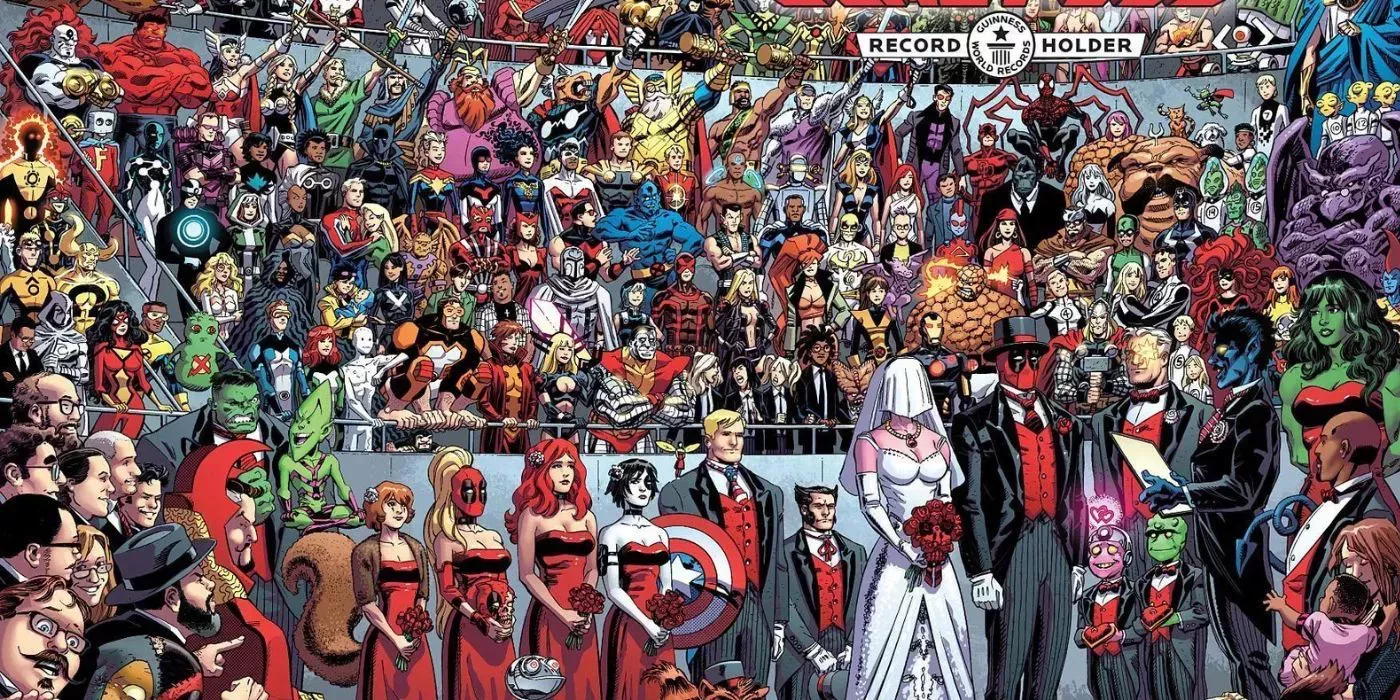 La portada incluye 232 personajes, de los cuales 224 se han contado como reconocibles para el registro. Todos estos personajes son invitados a la boda de Wade. La lista incluye una mezcla de amigos y enemigos, y personajes tanto vivos como muertos. Este es un gran ejemplo de que Deadpool existe en un nivel diferente al de otros personajes de Marvel. Es capaz de reunir a cientos de personajes y romper récords en el proceso.