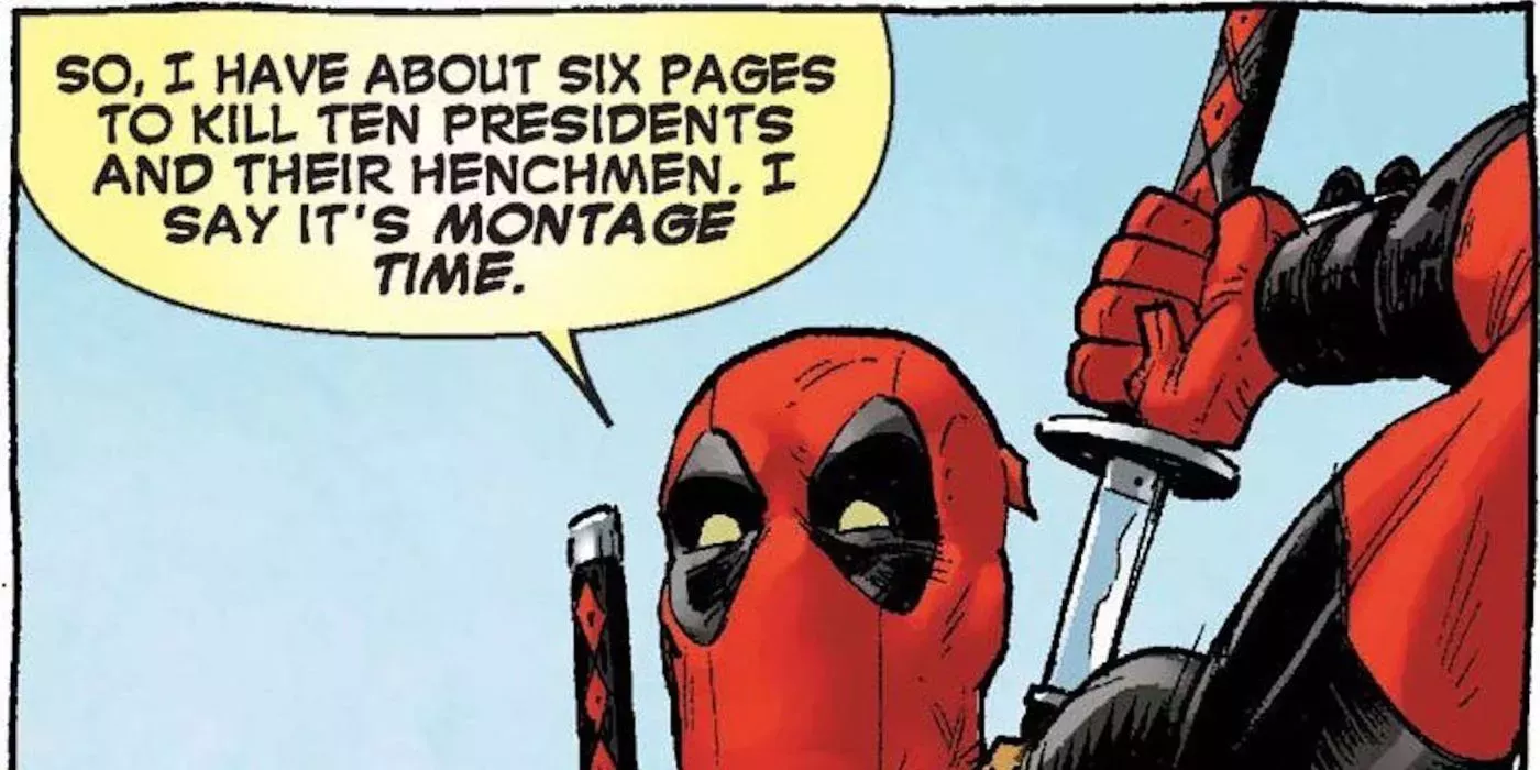 Sabiendo que tiene mucha gente que matar y que le quedan muy pocas páginas en el libro, Deadpool sugiere un montaje para acelerar las cosas. Le ordena al lector que ponga la canción Five Minutes Alone de Pantera o, si no la tiene, "ponga la mierda que le guste". Este nivel de compromiso conecta aún más al lector con Deadpool y los acontecimientos de la historia.