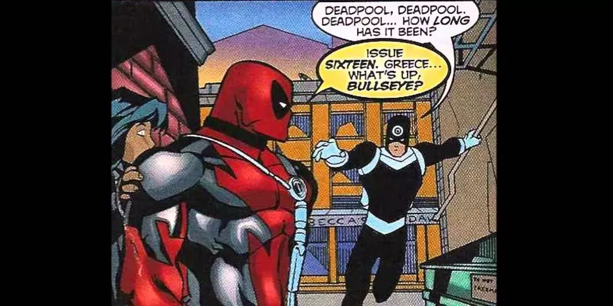 La primera ruptura de la cuarta pared de Deadpool se produjo en Deadpool #28 de Joe Kelly y Pete Woods. En este número, Deadpool se reúne con Bullseye, quien le pregunta: "¿Cuánto tiempo ha pasado?". Sin perder el ritmo, Deadpool responde: "El número dieciséis".