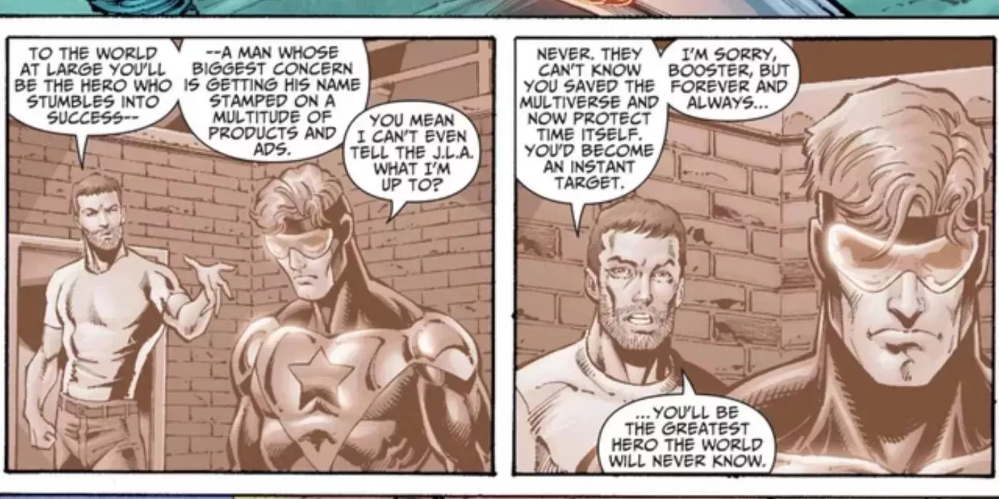 Al final de su aventura, Booster Gold incluso asume la culpa de los errores de Superman con la línea temporal, y cuando se da cuenta de que la mujer y el suegro de Superman fueron asesinados durante su ausencia, reinicia la línea temporal como muestra de agradecimiento, sabiendo que se metería en serios problemas por hacerlo.
