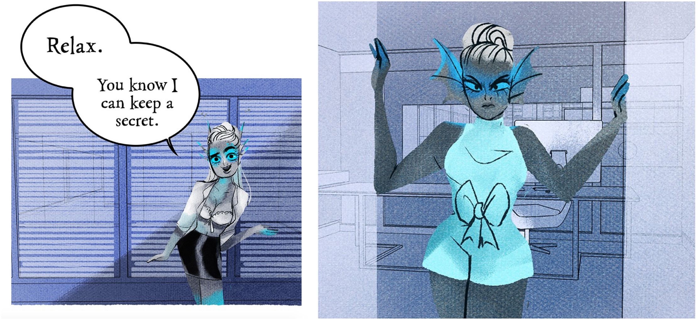 Posiblemente el atuendo que mejor ilustra el poder y el encanto de Thetis es cuando la vemos, inesperadamente, coqueteando con Zeus en la oficina, con la ropa y el pelo despeinados. Su demi-sostén arrugado, una simple falda blanca de cuello abotonado, una falda negra ajustada y brillante, el pelo recogido en un moño desordenado.