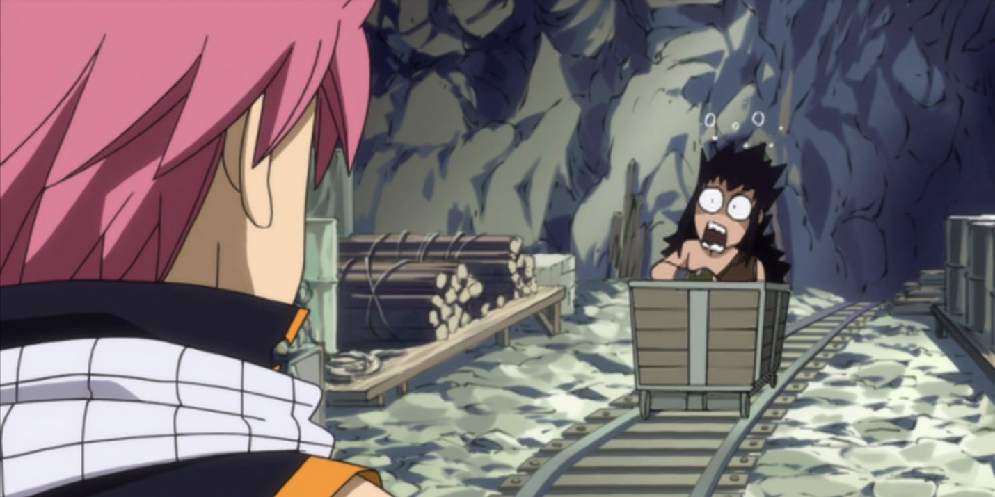 La pelea parecía bastante unilateral, con Sting y Rogue de pie sobre las miembros de la cola de hadas derrotadas. Sin embargo, se levantaron y comenzaron a pelear entre ellos, lanzando insultos y puñetazos. Entonces, Natsu hizo algo absolutamente asombroso: Empujó a Gajeel a un carro de minas vacío y lo envió rodando por las vías antes de que este último pudiera escapar. Después de que Gajeel cayera en picado a la ruina de su carro de la mina, Natsu dejó salir la risa de la firma del asesino del dragón de hierro "gee hee", haciendo que el momento fuera mucho más tonto.