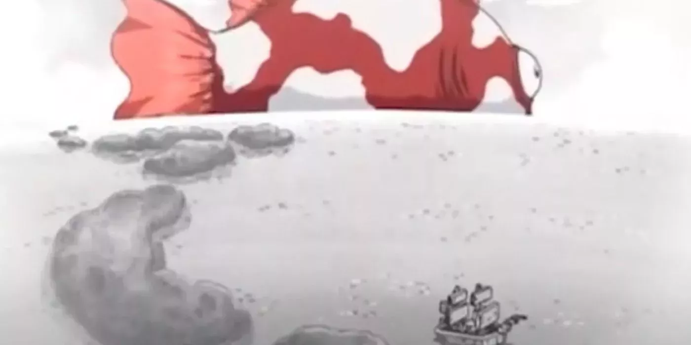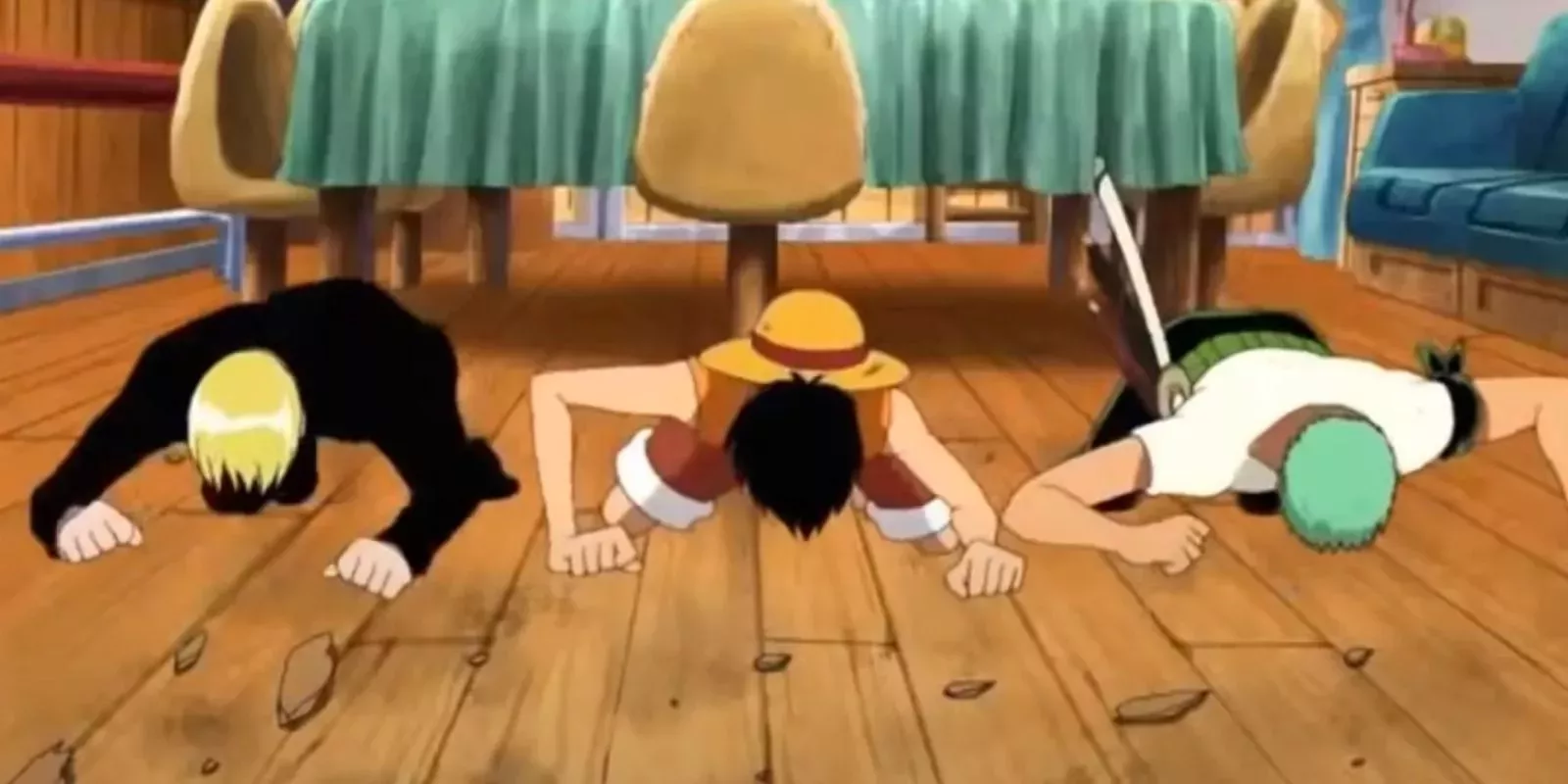 Sanji ni siquiera puede terminar su frase despectiva antes de que el barco salga volando directamente por una cascada. La sorpresa y el miedo en las caras de todos son divertidÃsimos, pero ninguno tanto como Usopp. Mientras los globos oculares de Sanji y Luffy se salen del cráneo, Usopp pierde también los dientes.