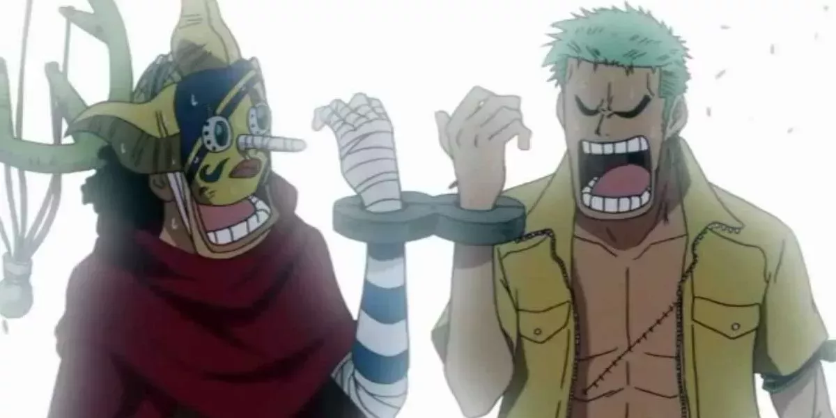 Lo peor de todo es que Usopp y Zoro acaban esposados juntos, lo que inhibe gravemente la capacidad de lucha de Zoro contra los agentes del CP9. En un acontecimiento sorprendente, Zoro obliga a Usopp a convertirse en su arma sujetando su espada derecha y manteniendo su cuerpo rÃgido. Sorprendentemente, esta estrategia funciona, aunque Usopp está aterrorizado y parece absurdo.