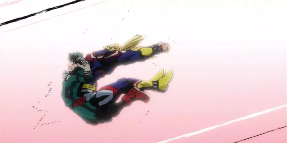 All Might es tan poderoso que acaba lanzándose contra Midoriya y rompiéndole la espalda. Más tarde, All Might es duramente reprendido por Recovery Girl por su imprudente comportamiento, pero si no hubieran tenido un sanador a la vista, Midoriya podría haber sufrido una lesión permanente.