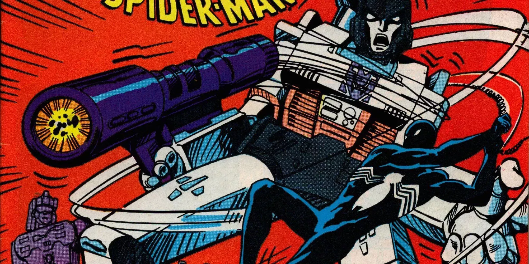 Así, en Transformers nº 3 , de Jim Salicrup, Frank Springer, Kim DeMulder, Mike Esposito, Nel Yomtov y Janice Chiang, los robots disfrazados se encuentran con el trepamuros Spiderman. Aunque los Transformers seguirían teniendo futuros cruces con personajes como los Nuevos Vengadores, es este número concreto el que sigue siendo el ejemplo más emblemático de su interconexión con Tierra-616.
