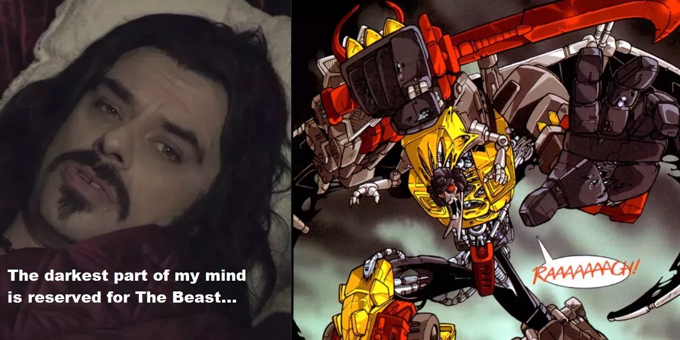 Mientras que Volcanicus, creado para la línea Power of the Primes, podría ser lo que la mayoría de los fans piensan, el combiner original de Grimlock y sus amigos era... LA BESTIA. Apareció por primera vez en The Beast Within, de Darren Jamieson y Dylan Gibson, como un extra en el lanzamiento en DVD de la temporada 2 de G1 de la compañía británica Metrodome, BEAST es un batiburrillo de horror corporal en un cómic tan mal concebido que se ha convertido en un chiste recurrente en el fandom de TF.