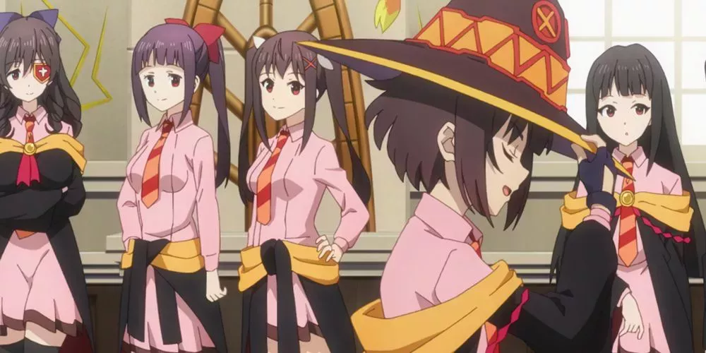 Los Crimson Demons son la mejor prueba de ello. Su moda y rasgos chuunibyou fueron enseñados como "tradición" por el Investigador Jefe, un otaku que fue transportado al mundo de Konosuba hace mucho tiempo. A menudo se acusa al anime osekai de ser un transparente cumplimiento de deseos, pero Konosuba lo llevó a un extraño extremo de construcción del lore.