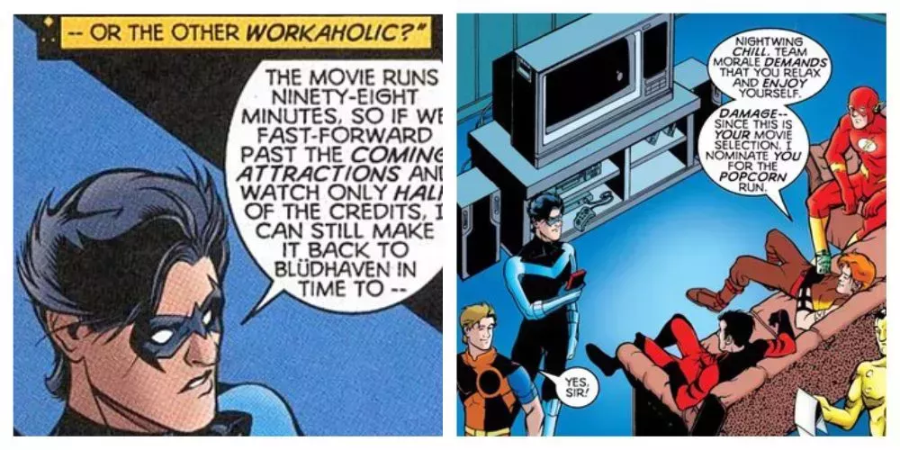 Los guionistas de DC suelen presentar a Nightwing como el alivio cómico de la familia del murciélago. Mientras se abre paso entre los malos a base de golpes, puñetazos y patadas, también suele soltar chistes. Dick es muy bueno a la hora de prestar atención a los demás sin juzgarlos, e incluso entonces tiende a mantener una conversación ligera con chistes.