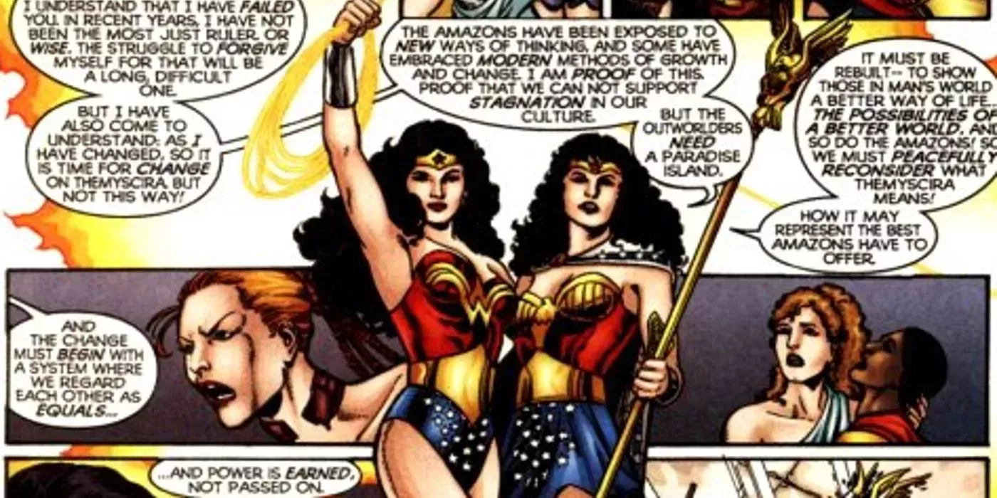 Un acontecimiento interesante en "Isla Paraíso Perdida" implica que la reina Hipólita asume el manto de Wonder Woman incluso después de que las amazonas de Bana-Mighdall sean derrotadas. Esto provoca una nueva ruptura entre Diana e Hipólita, ya que ambas unieron a las Amazonas renunciando a su papel como La Reina y Wonder Woman.