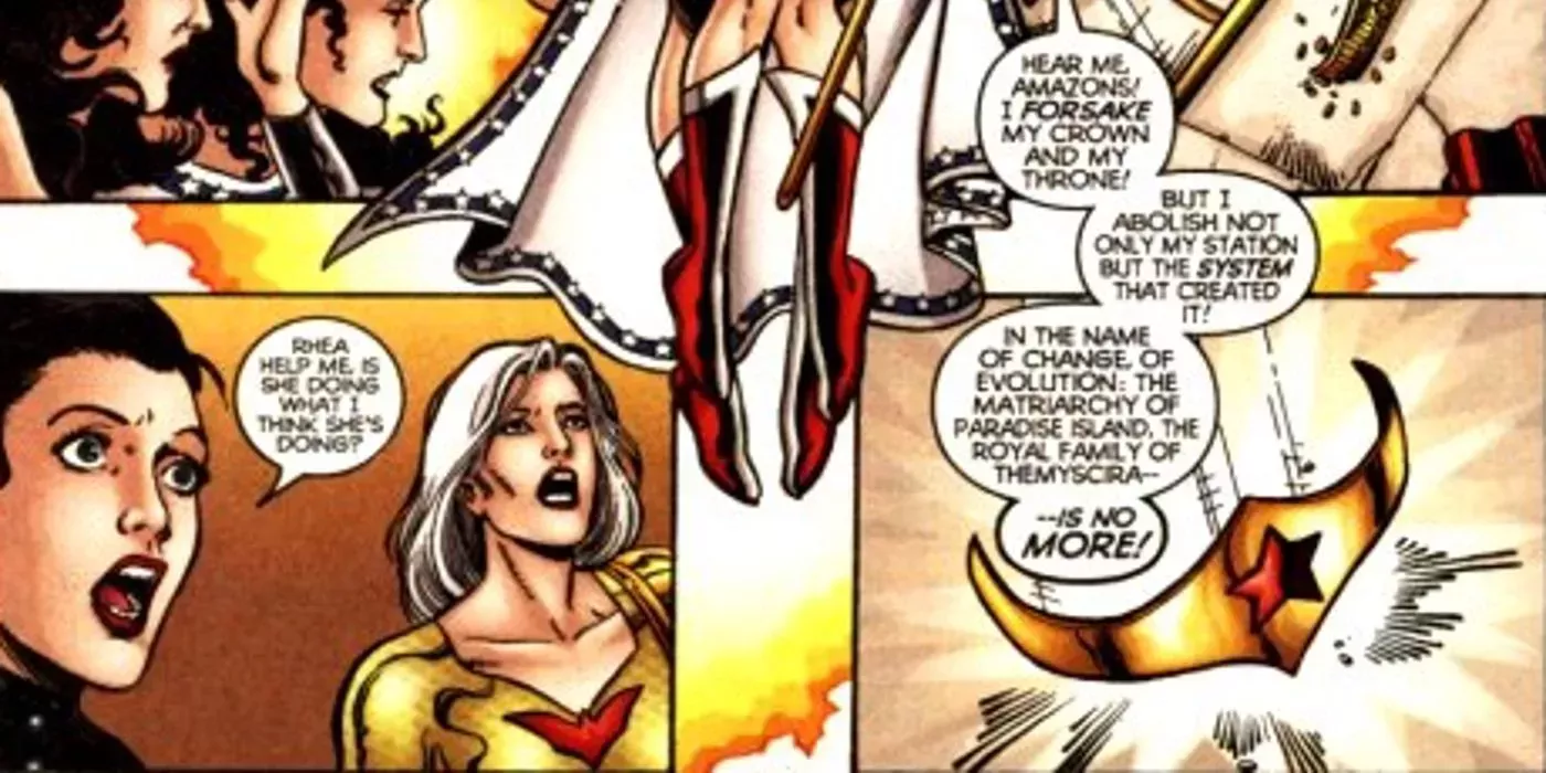 La reina Hipólita descubre que la guerra civil fue instigada por el espíritu del asesino de su hermana Antíope. Esto les permite a ella y a Diana sobrevolar Themyscira y detener la guerra antes de que la Isla Paraíso sufra más estragos. Aunque Hipólita demostró poderío físico con su excelente manejo de la espada, lo más poderoso que hace es renunciar a su corona y su trono, y renegar por completo de la Familia Real que sembró siglos de división entre las dos facciones de Amazonas en guerra.