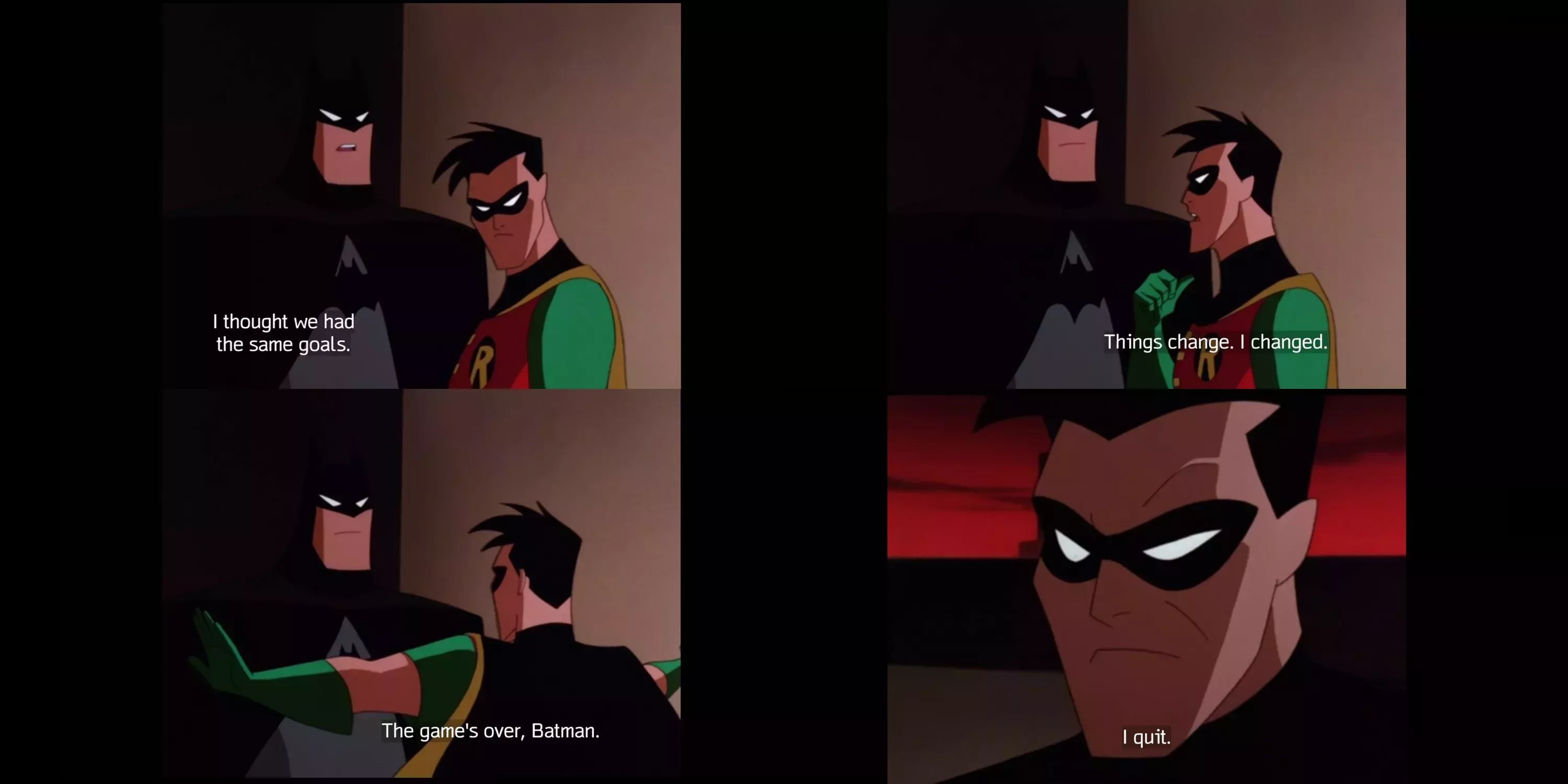 En el episodio "Old Wounds", Dick Grayson le cuenta a Tim Drake su ruptura con Bruce Wayne. No estaba de acuerdo con los métodos u objetivos de Batman y se sentía atrapado en su dinámica con Bruce, por lo que abandonó el Dúo Dinámico y finalmente se trasladó a Blüdhaven.