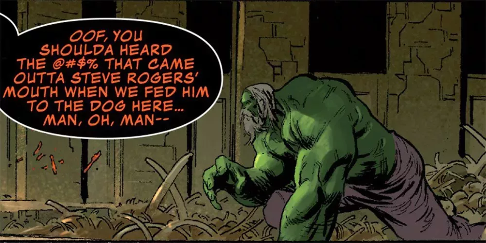 Más recientemente, en Thanos #15, de Donny Cates y Geoff Shaw, las cosas están inimaginablemente mal para Hulk en una línea temporal en la que Thanos ganó. Cuando un Thanos más joven llega al solitario castillo del Titán Loco, el Motorista Fantasma Cósmico lo conduce a un pozo donde Hulk, ahora poco más que una mascota, se sienta rodeado de los huesos de los amigos que se ha visto obligado a devorar.