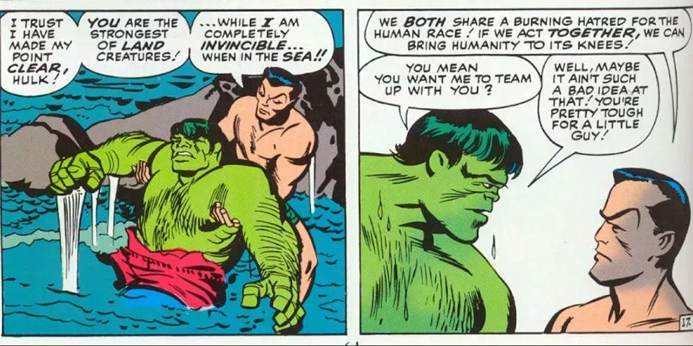 Hulk y Namor han luchado muchas veces. La primera victoria de Namor se produjo en Avengers #3, de Stan Lee, Jack Kirby, Paul Reinman y Stan Goldberg. Durante este primer período, la radiación gamma y el estrés convierten a Hulk en Banner, y no al revés.