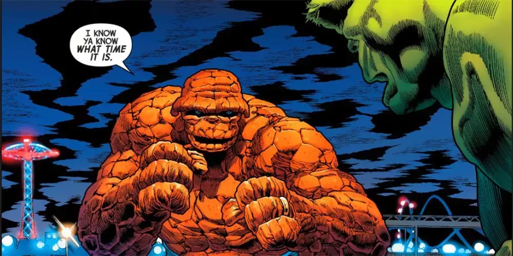 Hulk y la Cosa se han enfrentado desde principios de los años sesenta. Hulk gana la mayoría de sus combates, pero la Cosa ha aguantado más asaltos de los que la mayoría de la gente podría salir airosa. En Fantastic Four #13, escrito por Dan Slott con arte de Sean Izaakse, noquea a un Hulk controlado mentalmente a costa de su forma rocosa. Poco después, Hulk brutaliza a Ben durante su luna de miel.