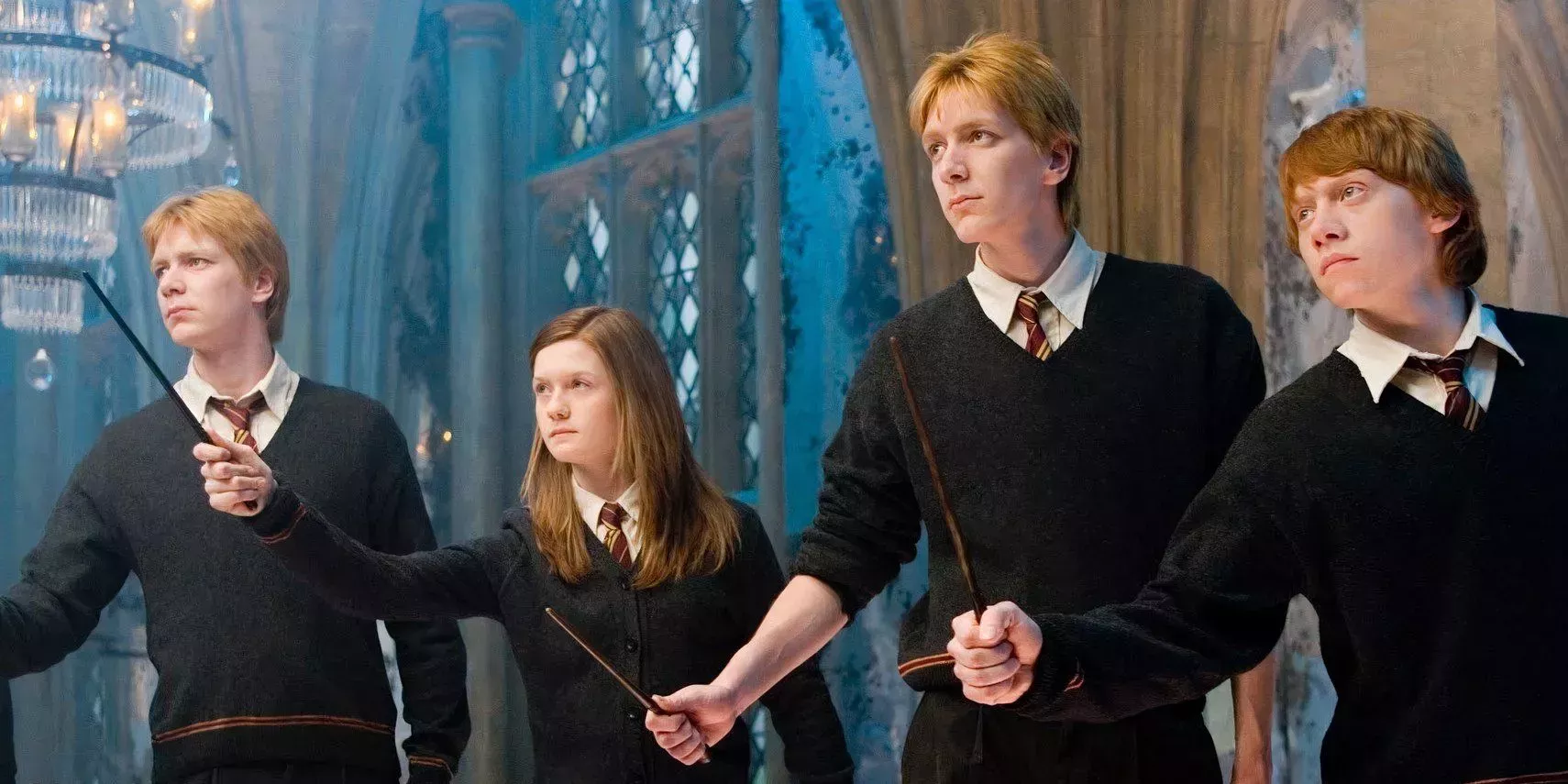 Los espectadores que no estén familiarizados con los libros puede que no se den cuenta de que hay otro miembro de la familia Weasley, Charlie. El segundo hijo mayor de los Weasley no aparece en la mayor parte de los libros, ya que trabaja con dragones en Rumanía. Regresa en Harry Potter y las Reliquias de la Muerte para luchar junto al resto de la Orden y sus aliados en la Segunda Guerra Mágica.