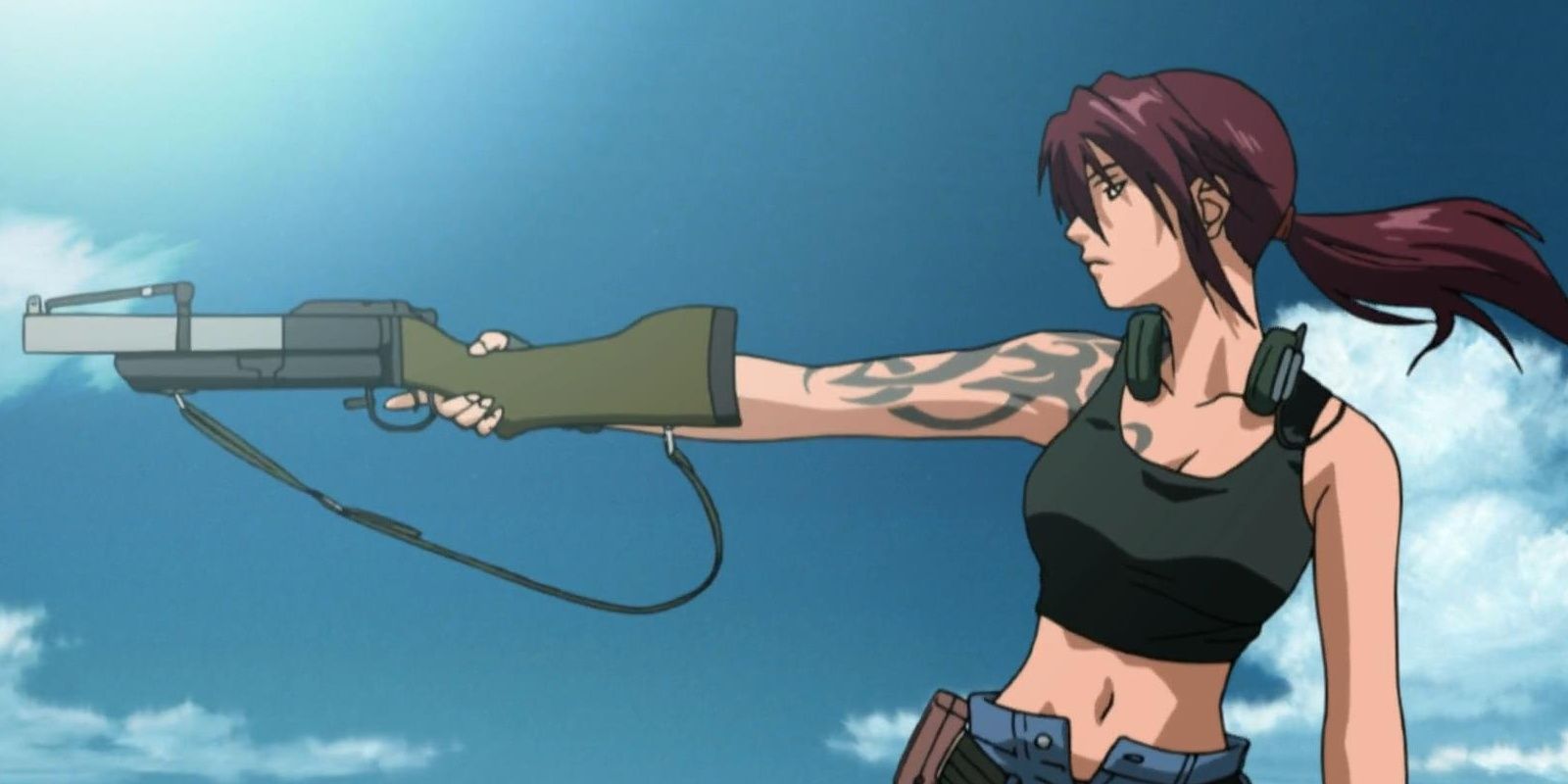 4 Revy es una mujer fuerte que muestra su tatuaje mientras empuña su pistola