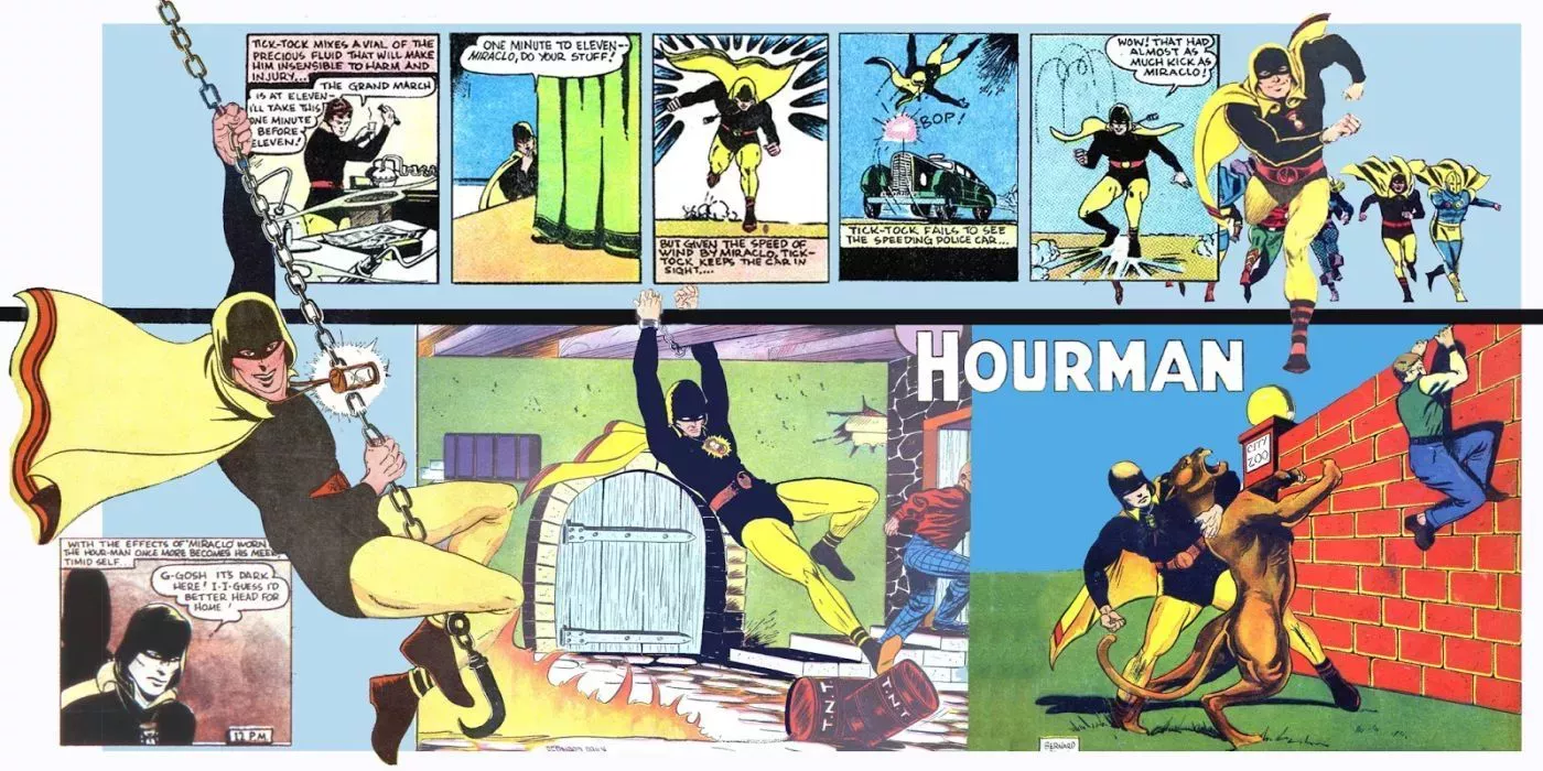 El Hourman de Rex Tyler, que debutó en el número 48 de Action Comics (Vol. 1) de Ken Fitch y Bernard Baily, era inicialmente único. Al tomar algo llamado "Miraclo", obtuvo superfuerza y agilidad durante una hora. Después de eso, Rex tenía que actuar como un héroe sin la medicina o pasar a las sombras hasta que tomara otra dosis.