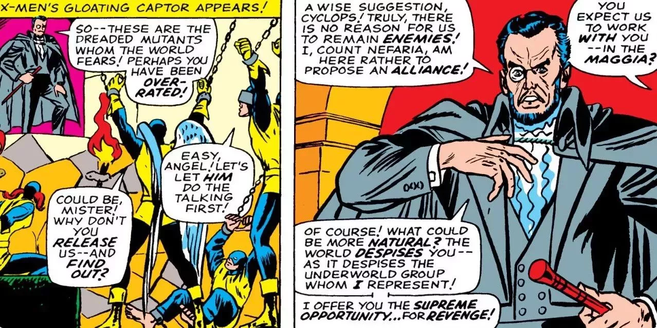 En Uncanny X-Men nº 22, el Conde Nefaria regresa como jefe de los Maggia, un poderoso sindicato del crimen. El villano contrata a Anguila, Puercoespín, Espantapájaros y Unicornio para detener a los X-Men, ayudado por el poder de ilusión del propio Nefaria. Eliminados individualmente e incapaces de trabajar en equipo, los X-Men pronto caen en manos de los lacayos del jefe del crimen.