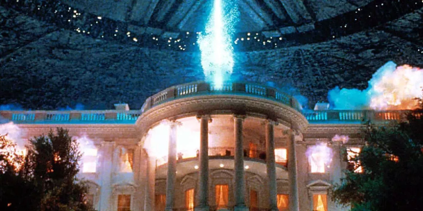 La Casa Blanca es un símbolo del poder del gobierno estadounidense, y el Día de la Independencia hace un gran uso de ella al hacerla volar. Al mismo tiempo que otros lugares emblemáticos son atacados de forma similar, un rayo de luz verde comienza a acumularse en la parte inferior de una nave alienígena. Se dispara hacia abajo, creando una espectacular explosión y una bola de fuego en toda la ciudad.