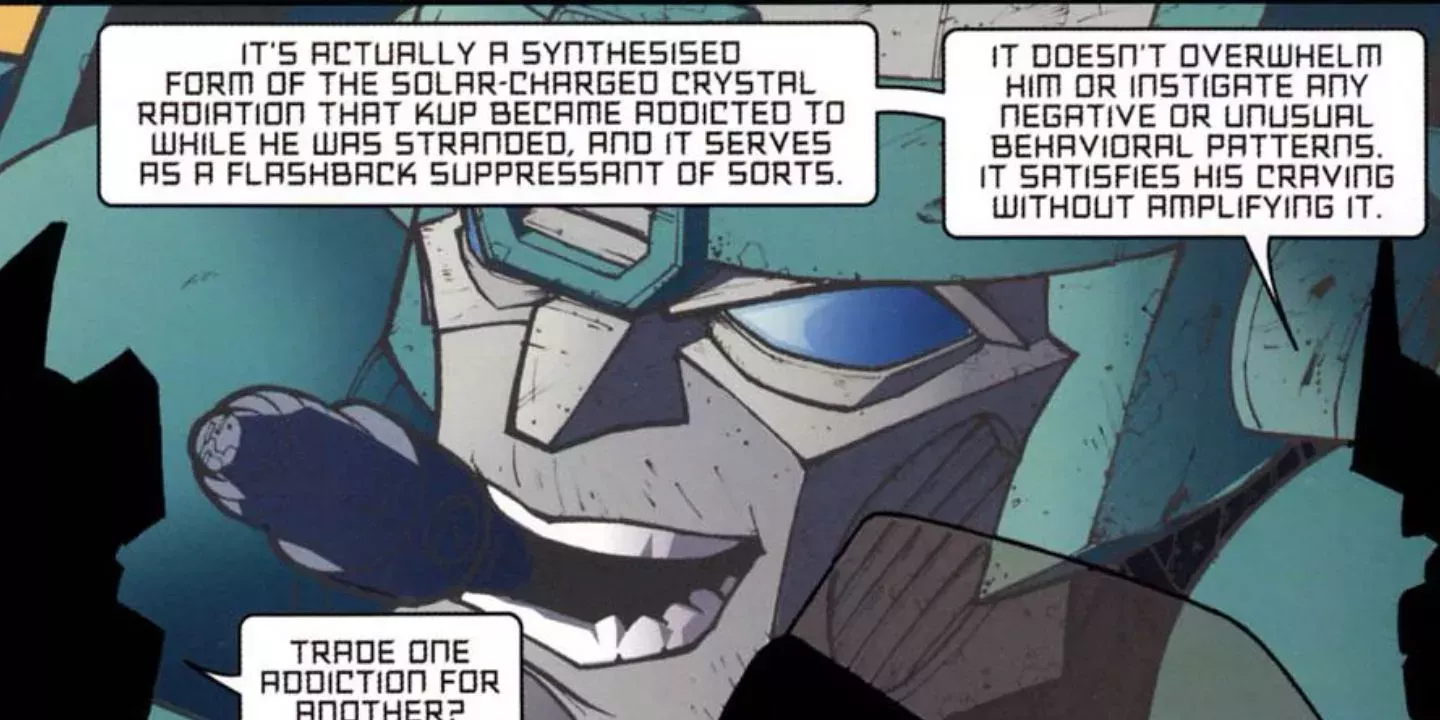 La historia del cómic revelaba que Kup había enloquecido una vez por culpa de una colección de cristales alucinógenos mientras estaba abandonado en el planeta Tsiehshi, lo que le llevó a asesinar violentamente a cualquier Autobot que intentara rescatarle. Finalmente, los Autobots Prowl y Perceptor fueron capaces de desarrollar el mencionado "Cy-Gar" para mantener a Kup lo suficientemente drogado como para que no cediera a sus tendencias homicidas, una explicación innecesariamente oscura para una elección de diseño de personaje cómica.