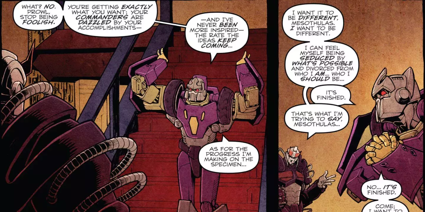 Ciertos Autobots, Decepticons e incluso sus descendientes Maximal han sido algunos de los Robots disfrazados más inteligentes de la franquicia Transformers.Cuando Prowl fue secuestrado por el científico psicópata Tarántulas durante la miniserie Sins of the Wreckers, los lectores recibieron pequeños datos sobre la naturaleza de la relación que Prowl y Tarántulas mantenían en el pasado. Sin embargo, la verdadera naturaleza del pasado de Prowl y Tarántulas fue una revelación impactante, ya que demostró que, aunque era miembro de los heroicos Autobots, Prowl tenía un pasado muy turbio.