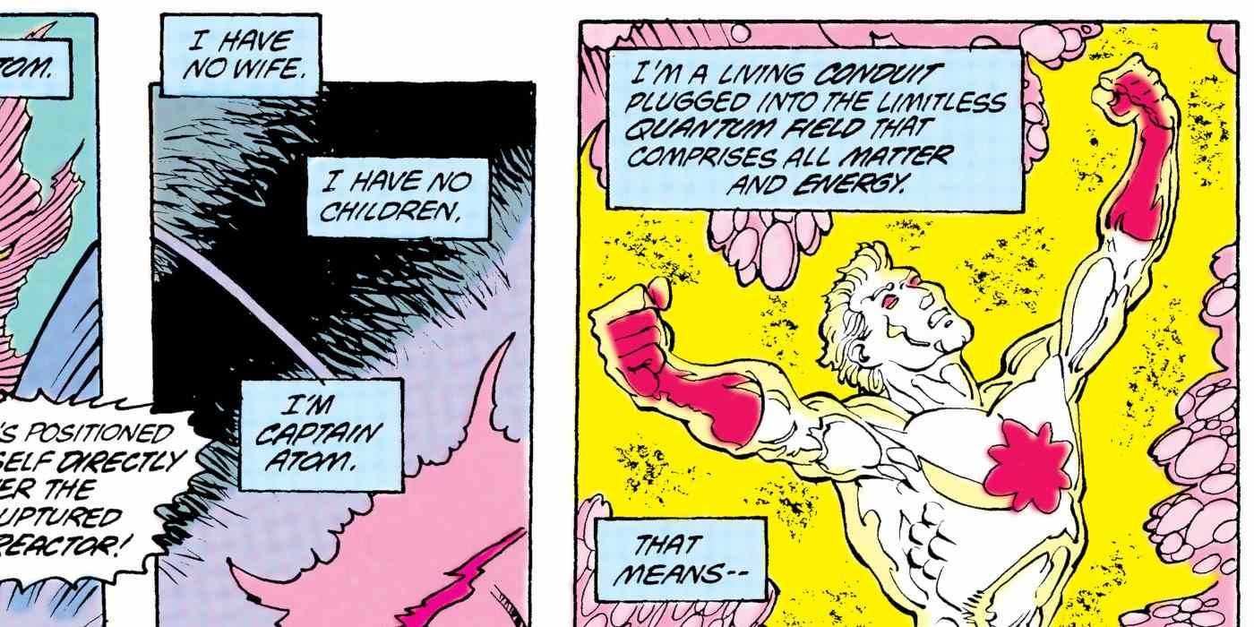 Este es un ejemplo del poder del Capitán Átomo sobre los propios átomos. Este poder es probablemente una de las razones por las que el Capitán Átomo no puede ser usado tanto como otros héroes de su calibre. Puede literalmente enfrentar a cualquier enemigo con facilidad, a menos que la escritura le dé a su enemigo algún tipo de armadura de complot.